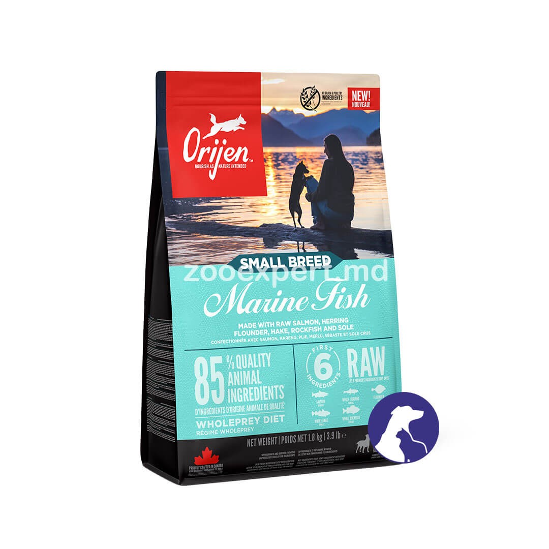 Orijen Small Breed Marine Fish - Высокобелковый биологически соответствующий сухой корм со свежим лососем, сельдью, камбалой, хеком, морским окунем и солеей, а также фруктами, овощами и травами для собак малых пород на всех стадиях жизни.